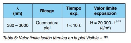 Las respuestas naturales de aversión protegen frente a exposiciones cortas (menos de 10 s) y poco intensas. Por tanto, el valor límite para la piel en el intervalo de 380-3000 nm, tiene por objeto evitar las quemaduras producidas por fuentes de corta duración con intensidades muy altas. (Tabla 6).