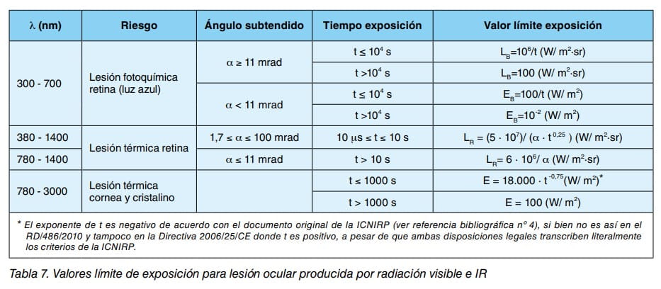 En el Real Decreto, los valores límite de exposición se definen como, “los límites basados directamente en los efectos sobre la salud comprobados y en consideraciones biológicas. El cumplimiento de estos límites garantizará que los trabajadores expuestos a fuentes articiales de radiación óptica estén protegidos contra todos los efectos nocivos para la salud que se conocen”.