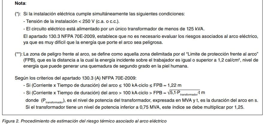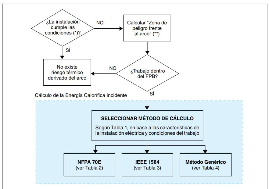 El apartado 130.3 de la NFPA 70E-2009 recomienda el procedimiento de la figura 2, para la estimación del riesgo térmico asociado a un arco eléctrico, al que puede verse expuesto un trabajador, en o en la proximidad de una instalación eléctrica en tensión.