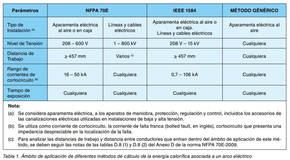 Una vez identificadas las características de la instalación y del trabajo a realizar, se selecciona el método NFPA 70E o IEEE 1584, en base a sus ámbitos de aplicación (ver tabla 1).