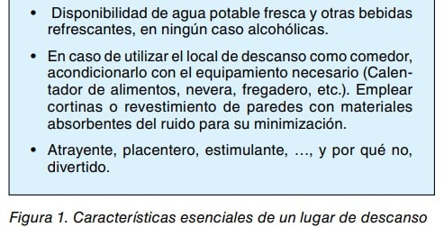 Exigencias mínimas reglamentarias El citado RD 486/1997, en su Anexo V sobre Servicios higiénicos y locales de descanso establece una serie de requisitos mínimos para tales lugares. En particular, respecto a locales específicos de descanso, demandados cuando la seguridad y salud de los trabajadores lo exijan, y en función del tipo de actividad, indica lo siguiente. Los comentarios que se apuntan al respecto no tienen consideración legal, solo pretender orientar en la aplicación de soluciones idóneas: