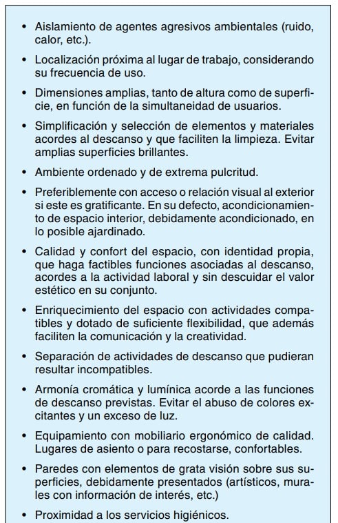 Posiblemente, dos palabras sintetizarían conceptos clave para un correcto diseño del hábitat laboral, que serían: “racionalidad humanista”. La primera representa que todas las fases de un proceso productivo se han de ligar de forma coherente y con la necesaria flexibilidad en diferentes ámbitos físicos que maximicen su eficiencia y faciliten el correcto desempeño de las personas. Pero sobre todo, ello ha de hacerse con visión humanista, situando en el punto de mira a las personas que han de ocupar tales espacios e intervenir en ellos. Nada debería ser diseñado sin considerar su relación con la función, posición y movilidad de las personas, con sus necesidades, exigencias y también con sus limitaciones. El centro de trabajo debería disponer de modo similar a una estructura urbana orgánicamente saludable y apetecible de vivir, de un conjunto de espacios y equipamientos que faciliten el trabajo, la formación, la convivencia, el enriquecimiento cultural y el descanso. Todo ello con la necesaria coherencia para su buen funcionamiento. . El Reglamento 486/1997 de Lugares de Trabajo aporta una serie de aspectos a considerar tanto en lo que se refiere a las condiciones generales de seguridad como de confort que deben reunir los ambientes físicos de trabajo, incluidos los espacios de descanso. Otras reglamentaciones aportan también algunos requisitos.