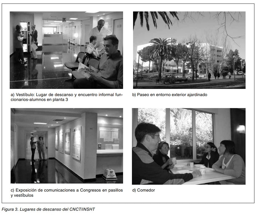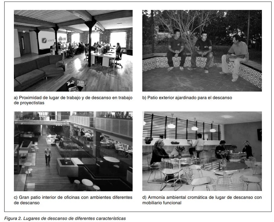 Muchas empresas facilitan que sus trabajadores puedan tomar su principal pausa de descanso en el exterior del centro de trabajo (ver figura 3b). Ello siempre suele resultar grato para la mayoría de personas, que optan por realizar un corto paseo, o tomar alimento o bebida con sus compañeros en una cafetería o restaurante próximo; aunque tal vez ese no sea el mejor lugar de descanso al estar densamente ocupado o ser el ambiente ruidoso. No obstante, hay que reconocer que el cambio absoluto de un ambiente laboral a otro completamente diferente y externo, incluso con la presencia de personas diferentes con las que también sea posible comunicarse, suele resultar atrayente.