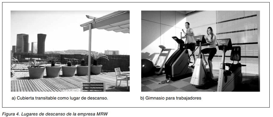 Puede resultar muy interesante realizar en la empresa un esfuerzo de búsqueda para la recuperación de posibles espacios que podrían estar asociados al descanso u otras finalidades sociales. Algunas empresas han reutilizado sus cubiertas transitables para convertirlas en interesantes espacios de esparcimiento al aire libre, cubiertos solo parcialmente. Algunas empresas lo han aplicado exitosamente para lugar de descanso, comedor, gimnasio o actividades deportivas para sus trabajadores, aprovechables incluso en tiempo de ocio (Ver figura 4).