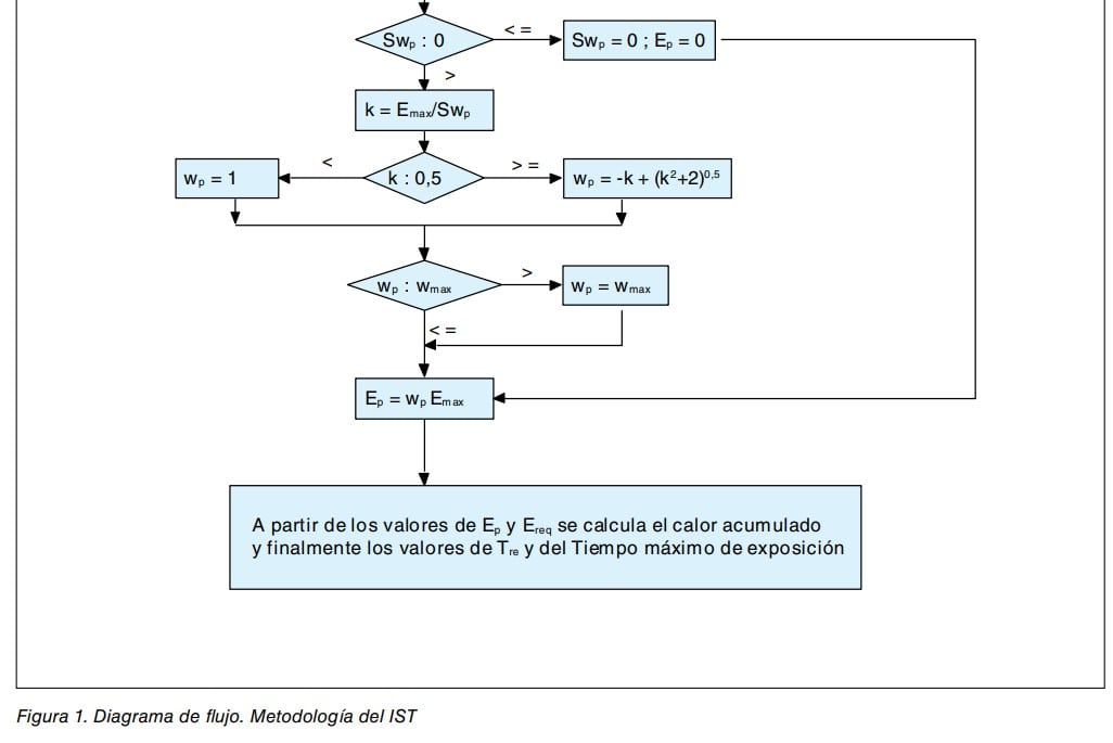 La forma en que se deben desarrollar los diferentes cálculos que constituyen el método IST se puede seguir mediante el diagrama de flujo que se presenta en la figura 1. Considerando los parámetros y expresiones men cionados en anteriores párrafos, se obtienen los valores de las siguientes variables para el instante ti, a partir de las condiciones del cuerpo en el instante anterior ti-1 y en función de las condiciones ambientales y metabólicas existentes durante el incremento de tiempo (1 minuto).