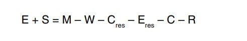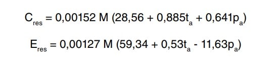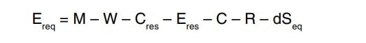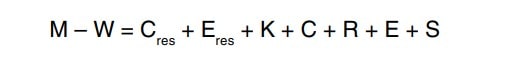 M es la tasa o potencia metabólica, W es la potencia mecánica efectiva, Cres y Eres representan los intercamres res bios de calor que se producen en el tracto respiratorio mediante convección y evaporación respectivamente, K, C y R representan los intercambios de calor que se producen en la piel mediante conducción, convección y radiación, E representa los intercambios de calor que se producen en la piel por evaporación del sudor y S es el almacenamiento de calor en el cuerpo que puede ser positivo o negativo, como se ha indicado. Por convenio se entiende, independientemente de los signos predeterminados de la ecuación, que un valor positivo de alguno de estos términos significa que el cuerpo gana calor y un valor negativo indica que lo pierde.