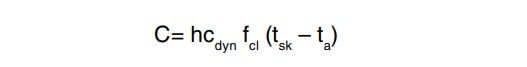 Debido a que las partes del cuerpo que están en contacto con objetos sólidos respecto a la superficie corporal son despreciables, al aislamiento que supone la ropa y a que, habitualmente, no existen superficies de contacto no aisladas que estén a una temperatura diferente de la piel, se puede despreciar el término K de conducción y la ecuación general del balance térmico se puede escribir así:
