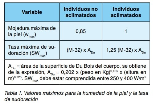 Los individuos aclimatados son capaces de transpirar más rápidamente, con más abundancia y más uniforme mente sobre la superficie de la piel, que los no aclimata dos. En consecuencia, los individuos aclimatados tienenmenor almacenamiento de calor y esfuerzo cardíaco (y menor temperatura interna), para una determinada situación. Además, pierden menos sales por el sudor, por lo que dichos individuos son capaces de resistir una mayor pérdida de agua. Con el fin de considerar las diferen cias en la respuesta de los individuos aclimatados y no aclimatados se consideran, en ambos casos, valores de referencia máximos de la humedad o mojadura de la piel y de la sudoración. (ver tabla 1).