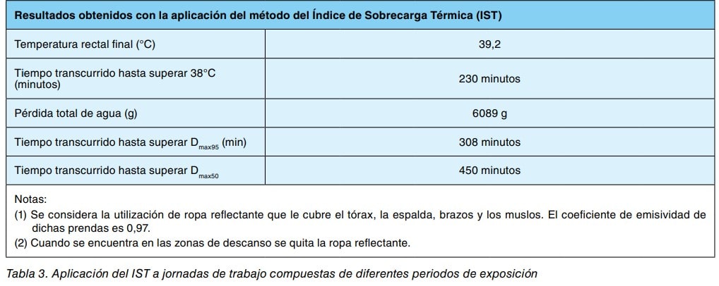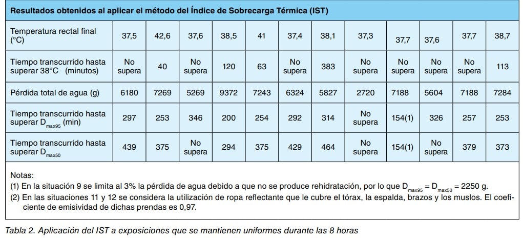 Además de los indicados en la tabla 1, el método fija valores máximos admisibles para la temperatura rectal de 38 °C, (en la metodología del ISR se limitaba el incremento de la temperatura interna) y para la pér dida de agua por deshidratación suponiendo que los trabajadores pueden beber agua durante el trabajo a voluntad. Para un individuo medio la pérdida de agua corporal máxima admisible (Dmax50) es del 7% de su peso total. Esta limitación se considera suficientemente pre ventiva para el 50% de la población. Una limitación mas conservadora, es la del 5% del peso corporal total, que supone proteger al 95% de la población trabajadora y por tanto a personas de respuesta mas sensible a la deshidratación (Dmax95).