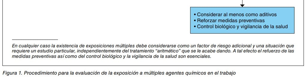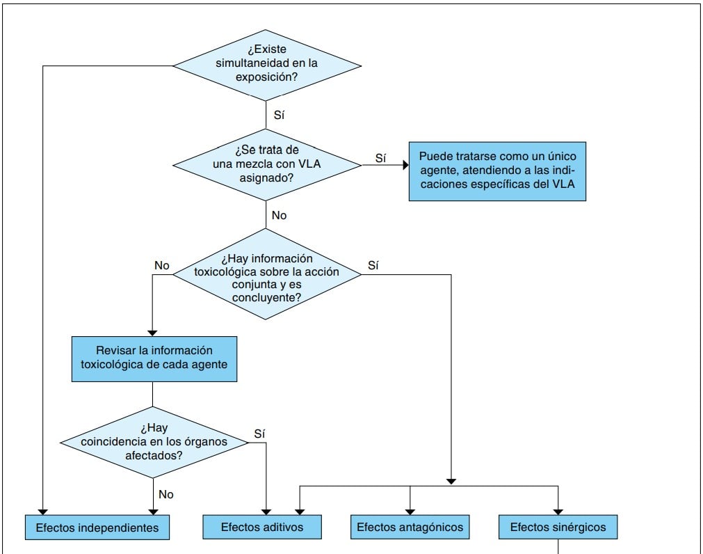 La evaluación de los efectos combinados a agentes químicos es una cuestión todavía poco estudiada y la información toxicológica disponible corresponde a los compuestos individuales. El documento sobre los límites de exposición profesional en España establece que “...cuando están presentes en el ambiente varios agentes que ejercen la misma acción sobre los mismos órganos o sistemas, es su efecto combinado el que requiere una consideración preferente. Dicho efecto combinado debe ser considerado como aditivo, salvo que se disponga de información que indique que los efectos son sinérgicos o bien independientes. ” .