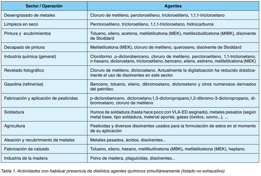 La coexistencia de varios agentes químicos es un hecho habitual en los puestos de trabajo y cobra especial relevancia en determinados sectores u operaciones (tabla 1). En estas situaciones la toma de decisiones se convierte en un proceso complejo donde influye no sólo el número de agentes y vías de exposición considerados, sino la posibilidad de que existan interacciones de distinta naturaleza entre los agentes, que determinen un nivel o tipo de riesgo distinto al que supondría la exposición independiente a los mismos. Existe poca información toxicológica sobre mezclas (incluso las más habitualmente presentes en entornos industriales, como disolventes, humos de combustión, etc) y en consecuencia es difícil encontrar directrices que indiquen cómo proceder en tales situaciones. Con carácter general, el procedimiento de actuación es la evaluación independiente de cada agente y la posterior determinación, mediante el análisis bibliográfico, de la necesidad de considerar interacciones entre agentes y en caso afirmativo el estudio de dicha interacción.