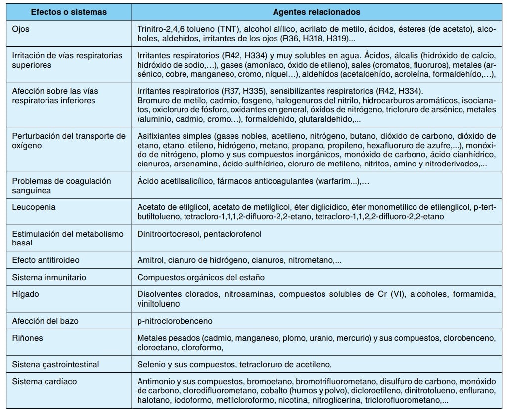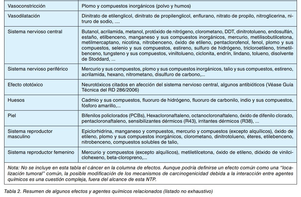 - Revisar la información toxicológica para conocer los efectos, los órganos diana y los mecanismos de acción de cada agente, así como información acerca de la acción conjunta (existe poca documentación publicada al respecto). A modo de resumen no exhaustivo se ofrece un listado de efectos sobre órganos y sistemas y de los agentes que pueden provocarlos (tabla 2). Esta información debe proceder de fuentes rigurosas y lo más actualizadas posible.