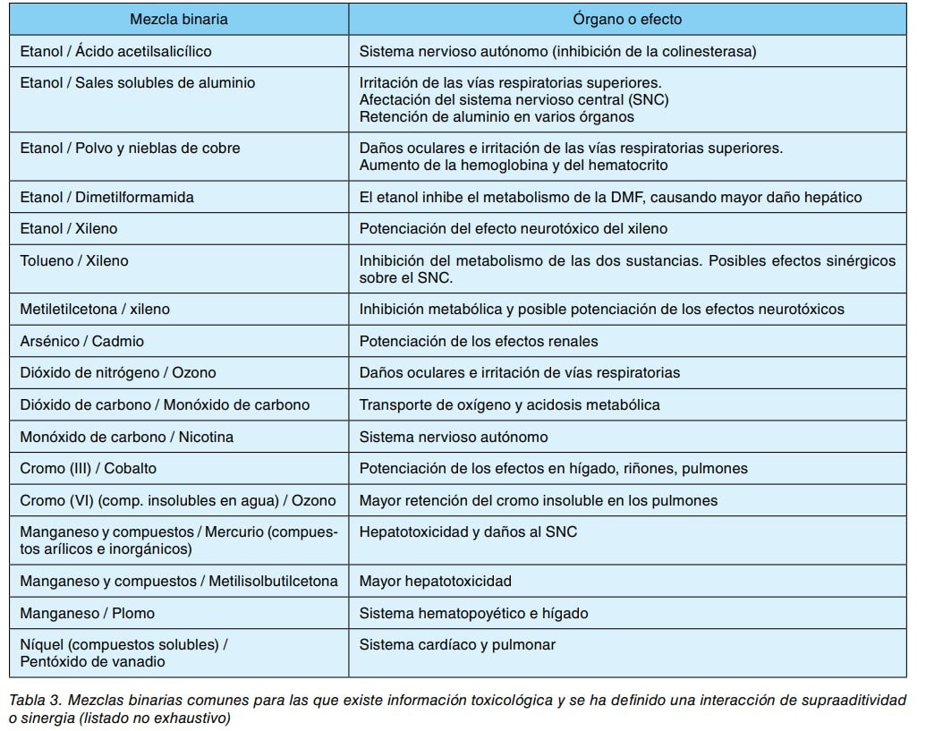 - Si existen agentes que actúan sobre el mismo órgano o sistema (incluso cuando no pueda afirmarse que ejercen la misma acción): a) Recabar información toxicológica sobre la acción conjunta de los agentes, que describa el tipo de efecto (aditivo, sinérgico, antagónico) (véase tabla 3). Si los efectos descritos son sinérgicos habrá que llevar a cabo un estudio individualizado para concretar las condiciones de exposición, reforzar las medidas preventivas (recordando que la sustitución es prioritaria) y especialmente desarrollar un programa de control biológico y de vigilancia de la salud (véase apartado sobre CONTROL BIOLÓGICO Y VIGILANCIA DE LA SALUD) que permita detectar alteraciones de forma precoz.