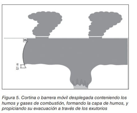 Si se practican aberturas y se subdivide la cara interna de la cubierta en compartimentos, con la ayuda de “barreras” o “cortinas” bajo la misma, se logrará que, en caso de incendio, la capa de humos y gases calientes permanezcan dentro de unos límites controlados.