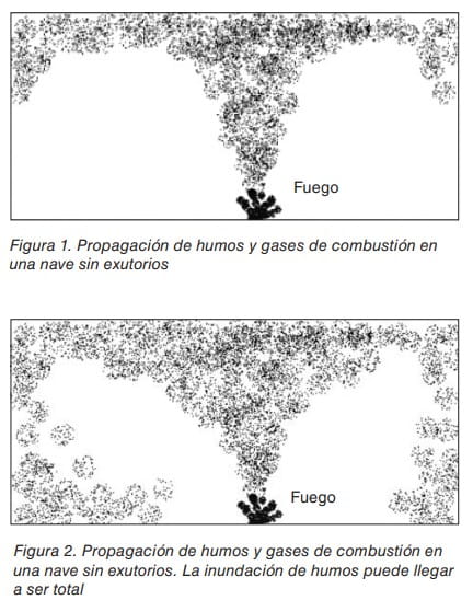 En ausencia de una extracción de humos, toda la zona o sector se llena con el humo y los gases calientes del incendio. (Figuras 1 y 2).