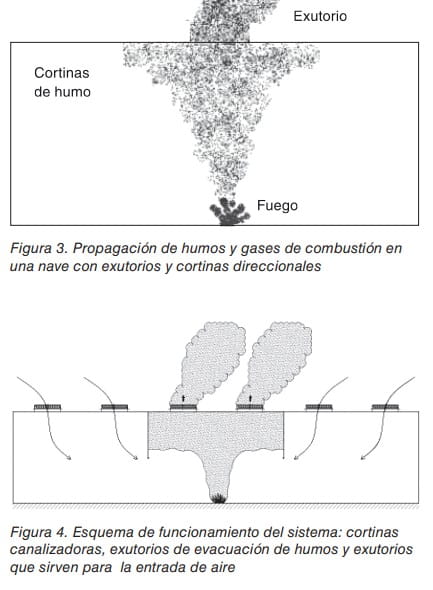 Las cortinas canalizadoras sirven para controlar y dirigir la salida del humo y los gases de combustión. Situadas en el techo, logran retenerlos formando un “depósito de humos” que evacuan por tiro natural hacia el exterior por las aberturas o exutorios instalados.