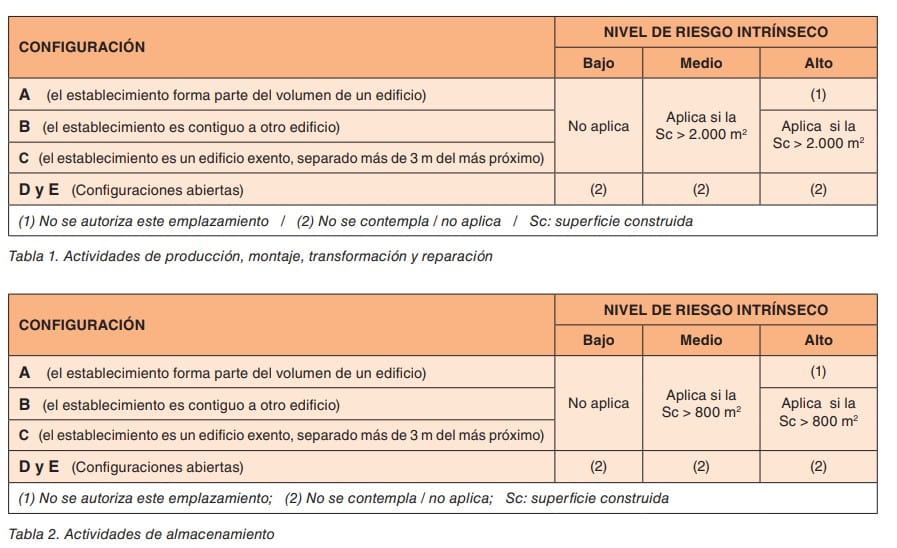 El ámbito de aplicación que determina este reglamen to está en función de las características del estableci miento industrial y según sea la actividad, de producción (tabla 1) y/o almacenamiento (tabla 2).