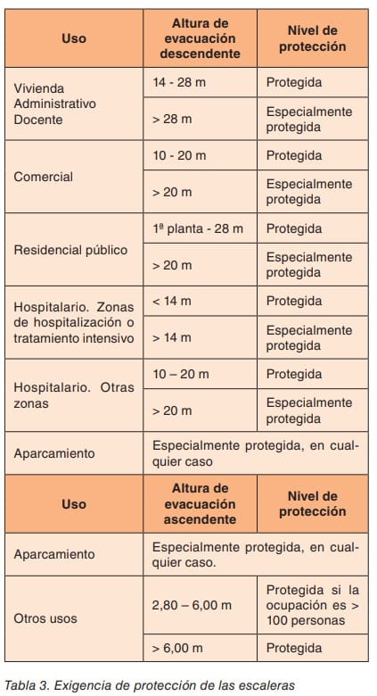 En cualquier caso, la protección de una escalera con el sistema de presión diferencial conforme a la EN 121016:2005 se contempla en el CTE como una forma de considerar la “escalera protegida” (CTE SI, Anejo SI A), condición exigible según la altura de evacuación y uso del edificio (CTE SI 3, 5 “Protección de las escaleras” – Ver tabla 3).