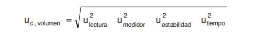 Una vez que se han evaluado y calculado las fuentes de incertidumbre asociadas al volumen de aire muestreado deben combinarse para obtener la incertidumbre típica combinada (Uc ,volumen), en %. La combinación de las componentes de incertidumbre se lleva a cabo aplicando la ley de propagación de errores, según la expresión: