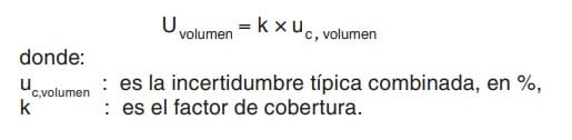 La incertidumbre expandida (Uvolumen) se calcula multiplicando la incertidumbre típica combinada por un factor de cobertura, k, de acuerdo con la expresión:
