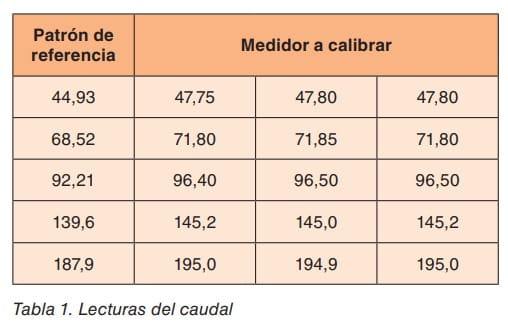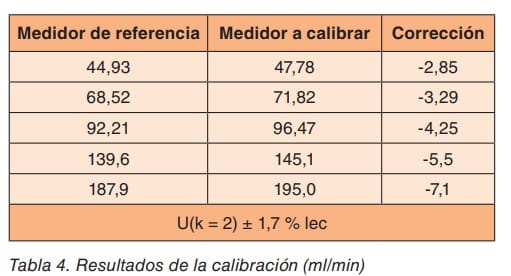 La tabla 1 recoge las lecturas repetidas de caudal en ml/min del medidor a calibrar y los valores medios del patrón de referencia en las condiciones de calibración: