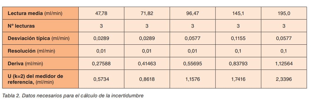 La tabla 2 recoge los datos necesarios para el cálculo de la incertidumbre.