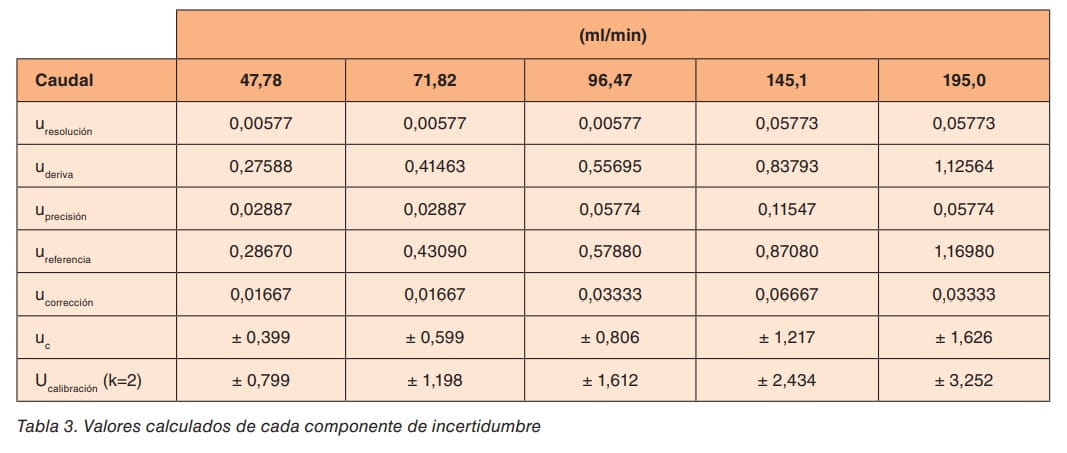 La incertidumbre típica combinada para cada punto de la calibración se obtiene combinando las componentes indicadas anteriormente de acuerdo con la expresión (A). La tabla 3 recoge los valores calculados de cada componente de incertidumbre.