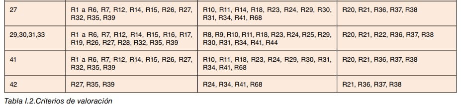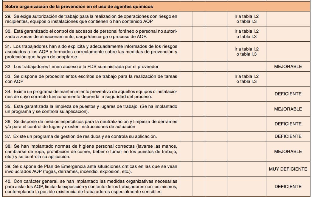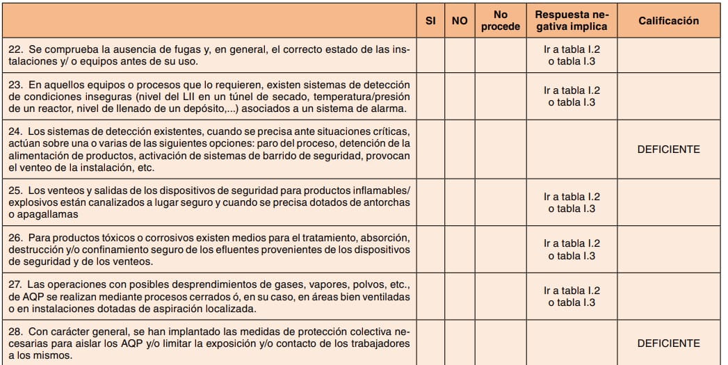Cualquier respuesta negativa a cada pregunta del cuestionario implica un determinado nivel de deficiencia que en algunos casos es independiente del AQP implicado (y se indica en el propio cuestionario) pero que, en general, depende de las frases R o H asignadas al AQP (Tabla I.2 o tabla I.3). Ello comporta que en principio la metodología tan solo sería aplicable a AQP que tengan asignada una frase R o H, es decir a productos comercializados, y que no podría aplicarse a productos que no dispongan de frase R o H, como pueden ser los productos intermedios, subproductos, residuos, etc... En estos supuestos, se deberá conocer la peligrosidad intrínseca de tales productos y asignarles la frase R o H más ajustada a su nivel de peligrosidad intrínseca.