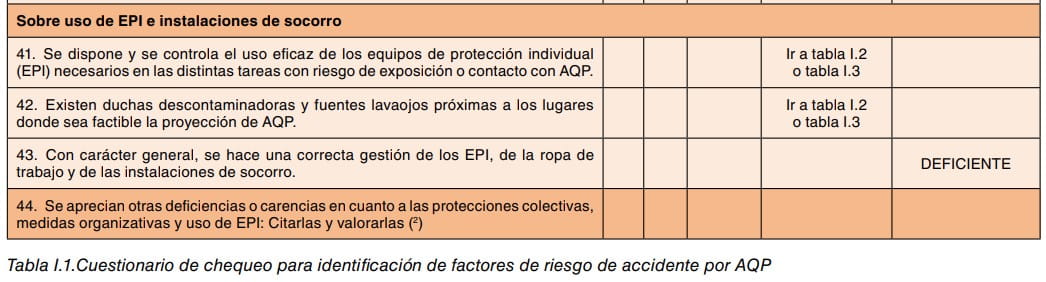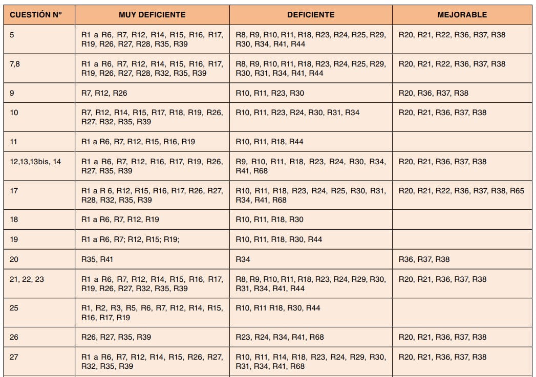 Así pues, para cada cuestión se obtiene una calificación que puede ser muy deficiente, deficiente o mejorable (en caso de que la cuestión sea procedente) en función de los factores de riesgo presentes y de la peligrosidad intrínseca del AQP conocida por sus frases de riesgo R o H. No se califica la cuestión nº 1, ya que al plantearse como una pregunta “llave”, su respuesta negativa significa que en la empresa no existen AQP y que, por tanto, no procede seguir cumplimentando el cuestionario.