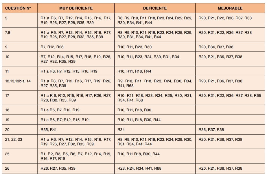 En función del conjunto de todas las respuestas se obtiene una calificación global del nivel de deficiencia, que puede ser muy deficiente, deficiente, mejorable o aceptable según los siguientes criterios: