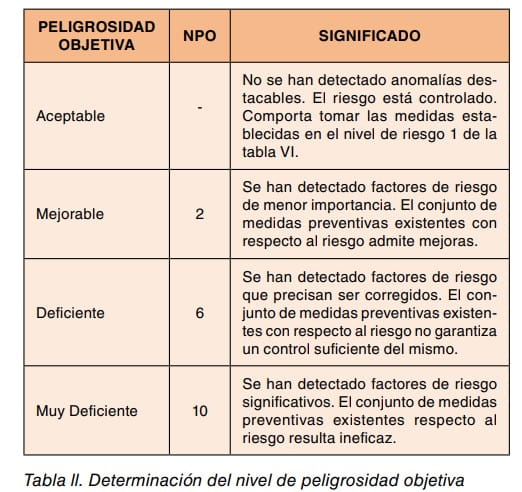 Los valores numéricos asignados a cada nivel de peligrosidad objetiva distinto, y el significado de los mismos, se indican en la tabla II.