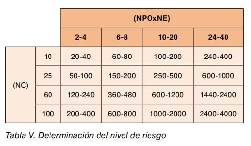 Todos los pasos seguidos hasta aquí conducen a la determinación del nivel de riesgo, que se obtiene mediante el producto del nivel de peligrosidad objetiva por el nivel de exposición y por el nivel de consecuencias (Tabla V).