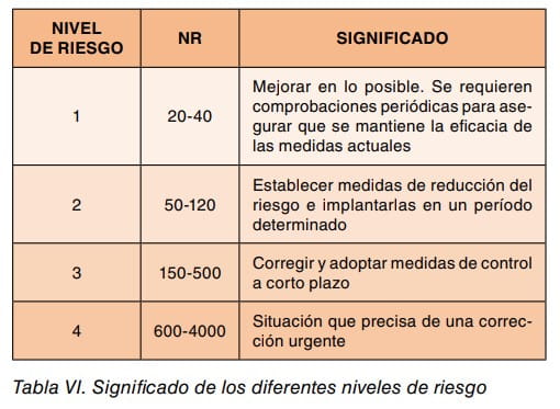 En la Tabla VI se detalla el significado de los cuatro niveles de riesgo obtenidos.