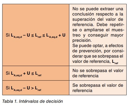 Sin embargo, la Guía Técnica del Real Decreto 286/2006 asume un intervalo de confianza bilateral, de forma que se compara el valor de referencia con el intervalo comprendido entre L Aeq,d - U y L Aeq,d + U. En este caso, puede darse la situación contemplada en el Anexo II del Real Decreto 286/2006, en la que el valor de referencia se sitúa dentro del intervalo de incertidumbre, esto es entre los valores LAeq,d U y LAeq,d + U. Se puede optar entonces bien por suponer que se supera dicho valor de referencia o bien por incrementar el número de medidas y/o su duración con el objetivo de reducir el intervalo de incertidumbre. Esta filosofía queda resumida en la tabla 1, extraída del Apéndice 5 de la Guía Técnica del Real Decreto 286/2006.