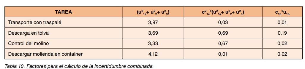 Según la ecuación (8) de la NTP 951 la incertidumbre combinada estándar, u, sería la indicada en la tabla 10.