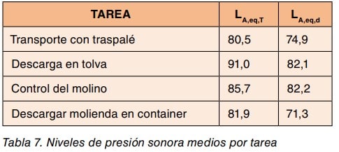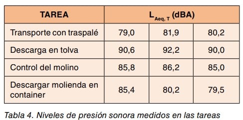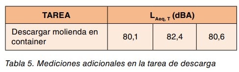 Se decide realizar mediciones del LAeq, T durante las distintas operaciones, diferenciando bien entre ellas para conocer la aportación de las diferentes fuentes de ruido, con dosímetros personales y se obtienen los resultados indicados en la tabla 4.