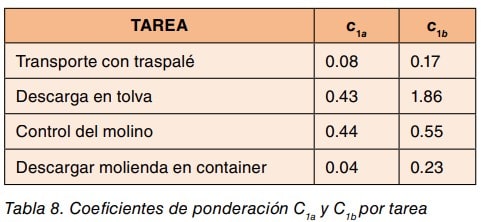El cálculo de los coeficientes de sensibilidad se realiza según las ecuaciones (9) y (10) de la parte II de esta NTP, los coeficientes de sensibilidad debidos al muestreo por tareas, c1a , y al cálculo de la duración de la tarea, c1b, para cada una de las cuatro tareas identificadas son los indicados en la tabla 8.