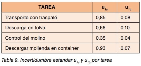 El cálculo de las incertidumbres estándar de cada tarea se efectúa según las ecuaciones (11) y (12) de la parte II de esta NTP, las incertidumbres estándar debidos al muestreo por tareas, u1a , y al cálculo de la duración de la tarea, u1b, para cada una de las tres tareas identificadas se indican en la tabla 9.
