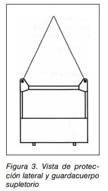 - Protecciones perimetrales: El perímetro de la cesta debe estar protegido mediante una protección lateral cerrada hasta una altura de al menos 0,5 m, de forma que una esfera de 20 mm no pueda atravesarla. Cuando la protección lateral no alcance la altura de 1 m, debe suplementarse con un guardacuerpo hasta la citada altura (Figura 3).