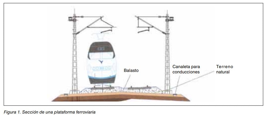 Las principales infraestructuras ferroviarias que actualmen te son empleadas en España son las siguientes: Ferrocarril Convencional, Ferrocarril de Alta Velocidad, Ferrocarril de Vía Estrecha, Tranvía y Metro. En la figura 1 se puede ver una sección de una plataforma ferroviaria de doble vía. De forma genérica, en este documento se desglosa en dos partes, una referida a las operaciones encaminadas al mantenimiento preventivo de la plataforma ferroviaria (capa de asiento, balasto, vía en placa, traviesa, carril, aparatos de vía, etc.) y otra correspondiente a las operaciones de mantenimiento preventivo de la electrificación e instalaciones (postes, semaforización, balizamiento, línea aérea de contacto, etc.).