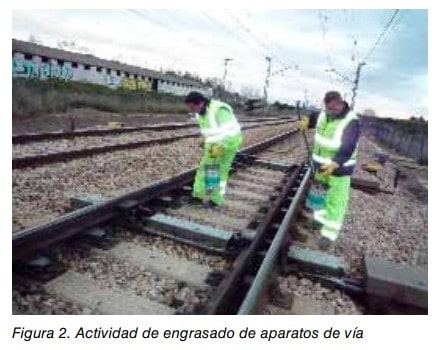- Engrasado de aparatos de vía: Actividades manuales de reposición de lubricante a los diferentes aparatos mecánicos (desvíos, cruzamientos, etc.). Ver figura 2.