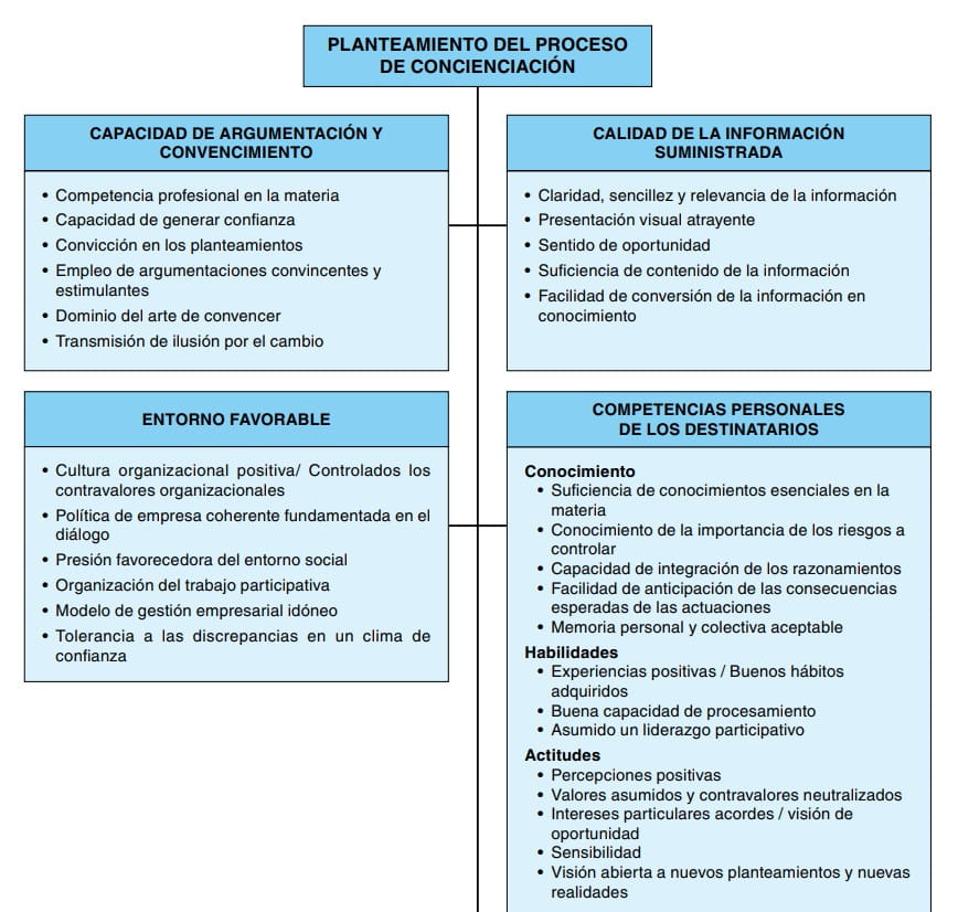 La concienciación preventiva de mandos y trabajadores es una tarea básica a realizar antes de proceder a la implantación de un sistema preventivo que pretenda ser eficaz. Antes de proceder a implantar algo nuevo como una actividad o un programa preventivo es imprescindible que las personas implicadas en su ejecución tomen conciencia de su necesidad y de los beneficios esperables. Hay que diferenciar las actividades propiamente de concienciación de las posteriores actividades formativas en PRL, aunque estas últimas también contribuyan y refuercen el proceso de concienciación. La legislación aborda la necesidad de generar una sensibilización de todo lo relativo a la PRL, especialmente en el capítulo introductorio de la propia Ley de PRL. El estándar OHSAS 18001 la sitúa como un requisito imprescindible a controlar, expresándolo en los siguientes términos: