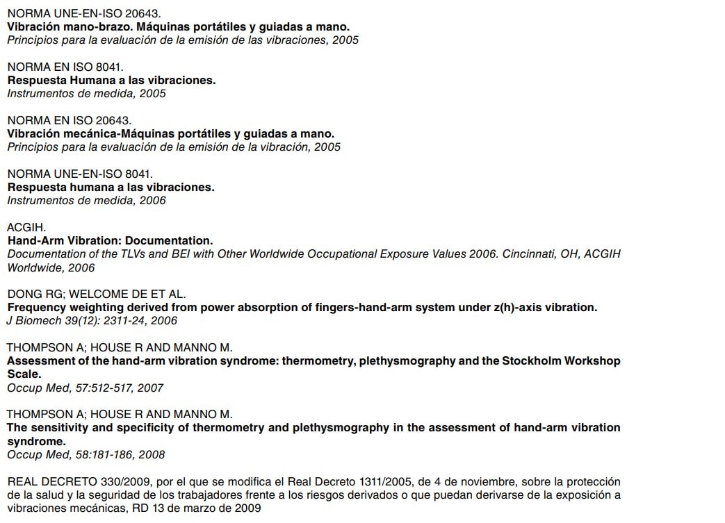 La vigilancia de la salud de los trabajadores expuestos a vibraciones debe hacerse de conformidad con lo dispuesto en el artículo 8 del Real Decreto 1311/2005, de 4 de noviembre, sobre la protección de los trabajadores expuestos a vibraciones mecánicas, en el artículo 22 de la Ley 31/1995, de 8 de noviembre, y en el artículo 37.3 del Reglamento de los servicios de prevención, aprobado por el Real Decreto 39/1997, de 17 de enero.