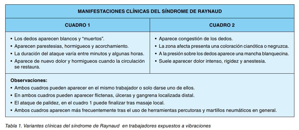 La clínica del síndrome de Raynaud no se manifiesta siempre por igual en todos los trabajadores afectados aunque suele existir una base común.