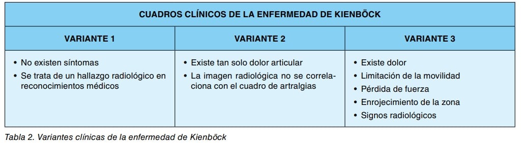 Las manifestaciones clínicas de los trastornos osteoarticulares son raras a nivel de la articulación del hombro, en trabajadores expuestos a vibraciones, aunque algunos estudios han puesto de manifiesto que la osteoartrosis de la articulación acromio-clavicular se origina con bastante frecuencia, seguida de la húmero-escapular. Otros estudios efectuados sobre población minera, afecta a vibraciones mano-brazo, han referido la ocurrencia de lesiones degenerativas de la articulación acromio-clavicular así como de tendinitis del hombro. Posiblemente los trastornos osteoarticulares más frecuentes, causados por exposición a vibraciones mano-brazo, sean los que se originan a nivel de la articulación de la muñeca, en especial la enfermedad de Kölher y sobre todo la enfer medad de Kiemböck que puede presentarse bajo tres variantes (tabla 2).