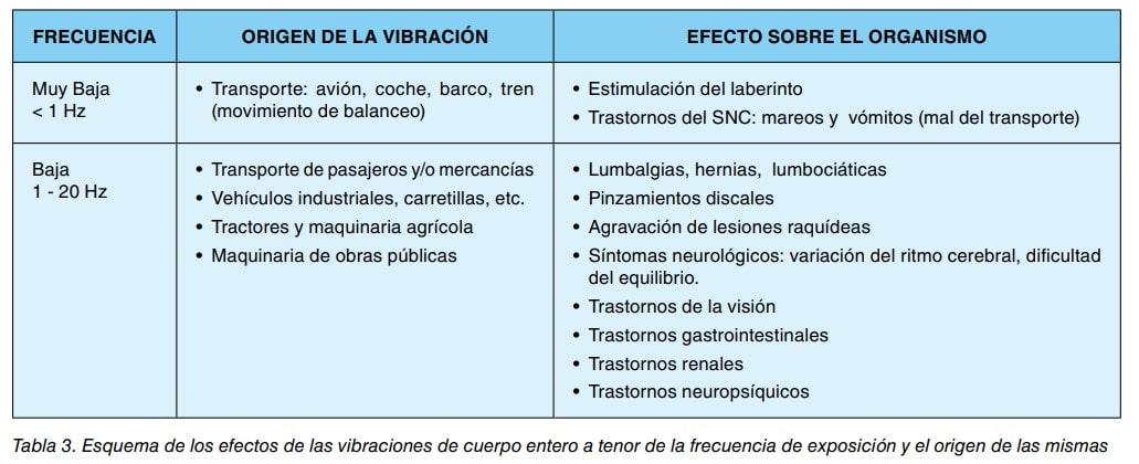 Los efectos derivados de la exposición a vibraciones de cuerpo entero y las actividades capaces de producirlas, no se citan en el mencionado cuadro. De forma resumida, los defectos descritos en los trabajadores expuestos a las mismas son: disconfort, lumbalgias, dolores en hombros y zona cervical y cinetosis. Las fuentes de exposición están ligadas principalmente a la conducción de vehículos y máquinas o a plataformas o pisos sometidos a vibración.