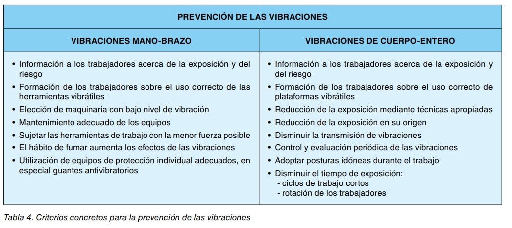 En la tabla 4 y a manera de resumen, se concretan algunos criterios preventivos en función del tipo de vibración transmitida.