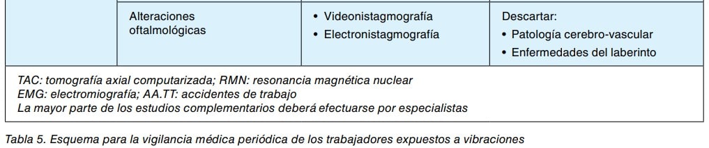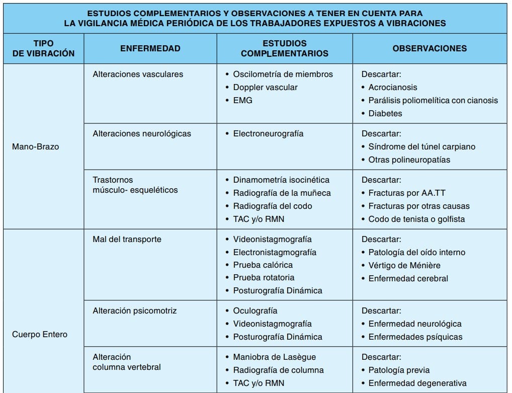 La vigilancia médica de los trabajadores expuestos a vibraciones consiste, en una primera instancia, en la evaluación de los datos recogidos en la anamnesis y en la exploración física. En este sentido cobran especial relevancia los cuestionarios de síntomas y algunas pruebas como el test de provocación por frío, destreza manual o el umbral de percepción vibratoria. Posteriormente, en función del resultado de esta primera fase y a criterio médico, se debe decidir acerca de la conveniencia de someter al trabajador a ciertas exploraciones complementarias.