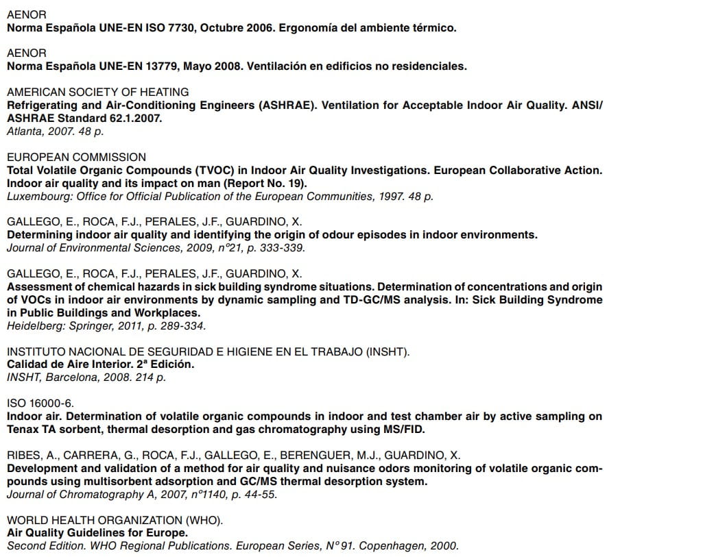 Los COV más abundantes en ambientes interiores públicos y privados son tolueno, benceno, etilbenceno, m+p-xilenos, 1,2,4-trimetilbenceno, 1,3,5-trimetilbenceno, limoneno, α-pineno, p-diclorobenceno, tricloroetileno, tetracloroetileno, decano, cloroformo, hexanal, nonanal, acetona y 2-butoxietanol. En el caso que los COV encontrados no sean los esperados y más comunes en ambientes interiores, es recomendable hacer una revisión exhaustiva de las actividades desarrolladas en el entorno del edificio afectado para detectar los posibles focos de emisión de los COV encontrados en el aire interior evaluado.