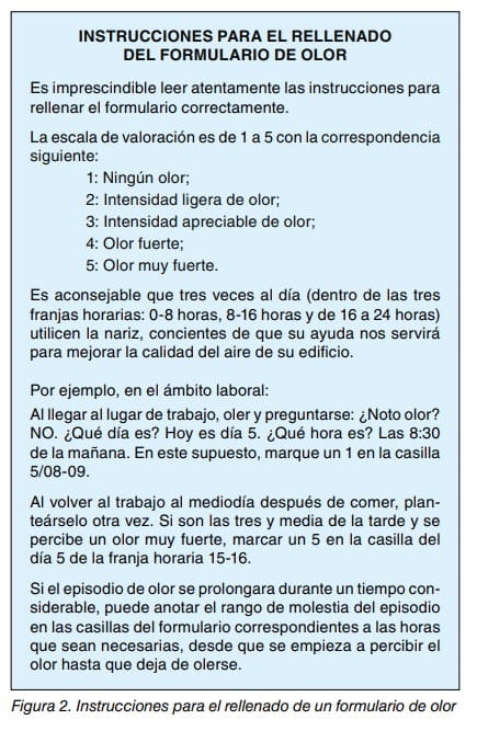 El formulario debe llenarse con valores numéricos del 1 al 5 dependiendo de la intensidad del olor percibido. En la figura 2, se incluye las instrucciones para su cumpli mentación que se entregarán junto con el formulario para el estudio de olores/molestia del edificio.